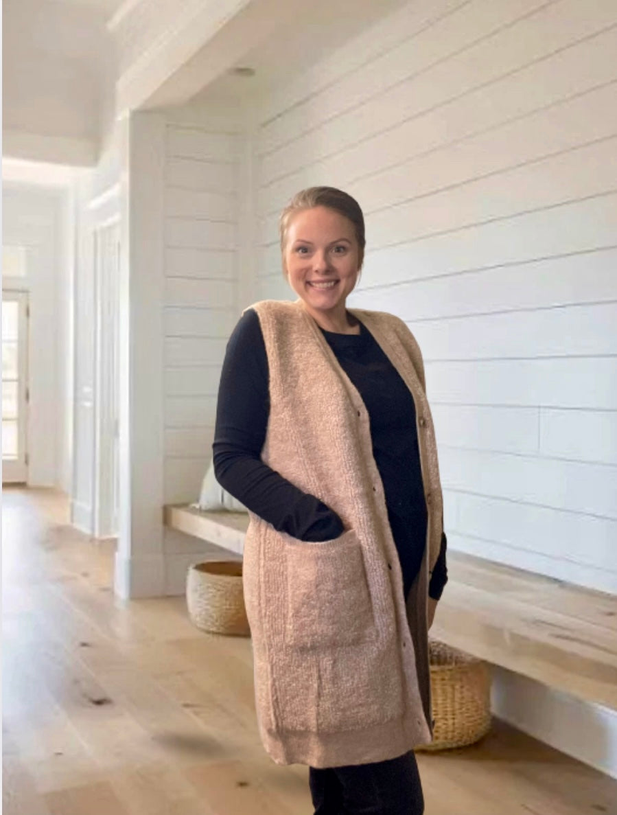 Button down V-neck teddy knit long lined vest. This cozy vest features a plush teddy knit fabric that adds a touch of warmth and texture to your outfit. The button-down front and V-neckline create a classic and versatile look, while the longline silhouette ensures extra coverage and comfort. Perfect for layering over your favorite tops and sweaters, this vest combines style and functionality for a chic and cozy ensemble.