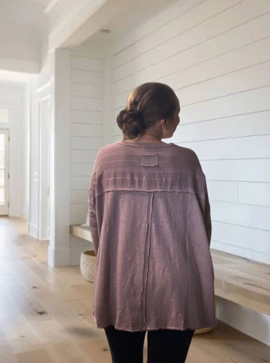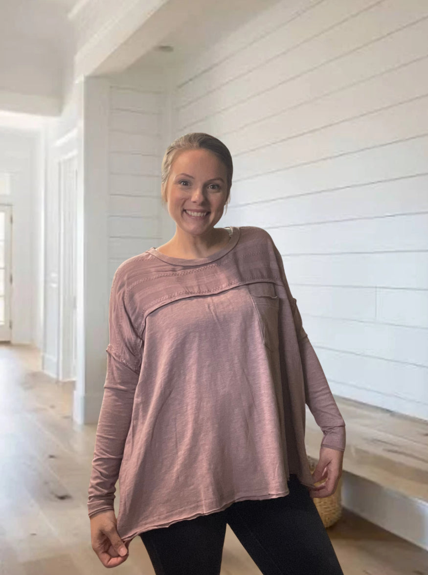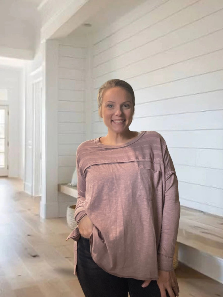 EMBROIDERED YOKE LONG SLEEVE POCKET TEE! FEATURES RAW HEMS AND CONTRASTING EMBROIDERED YOKE ON BACK AND FRONT.