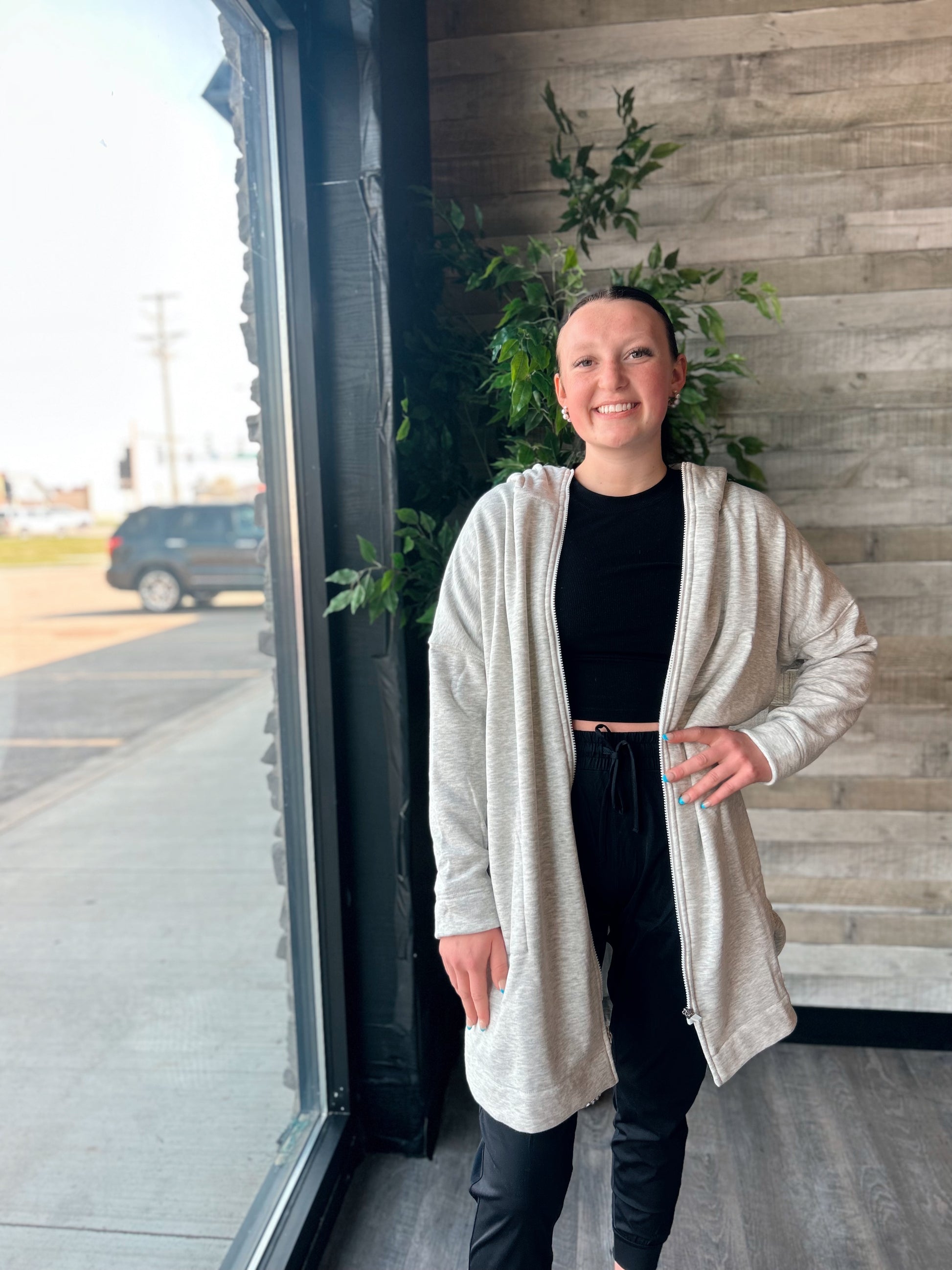 Cozy up in this longline zip up hoodie jacket. It falls to about mid-thigh length, has a soft interior, a curved hemline with notched sides, and side pockets with curvilinear stitching.
