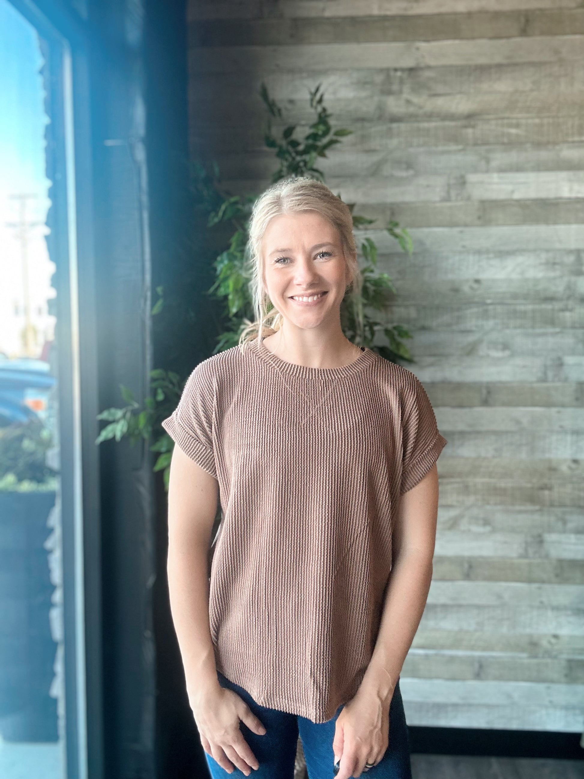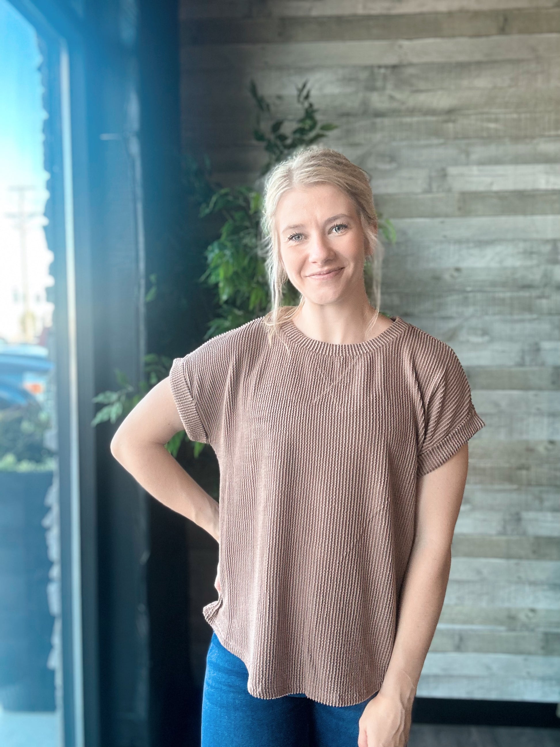 We LOVE this color and the ribbed texture. Perfect transitional piece from summer to fall!