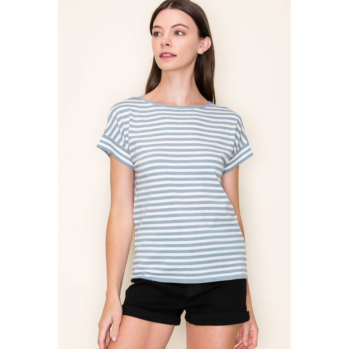 WIDE CREW NECK, SHORT SLEEVE, LIEN LIKE STRIPED SWEATER TOP